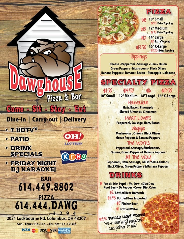 Welcome to Dawghouse Pizza & Bar, where culinary delights meet a vibrant atmosphere! Located at 2031 Lockbourne Rd in Columbus, OH, Dawghouse specializes in mouthwatering pizzas and delectable chicken wings, ideal for gathering with friends or family. The menu is a treasure trove; patrons rave about the pizza and the potato skins, claiming they’re simply irresistible. Whether you’re in the mood for a casual night out or a celebration, this venue welcomes all, including your furry friends!
